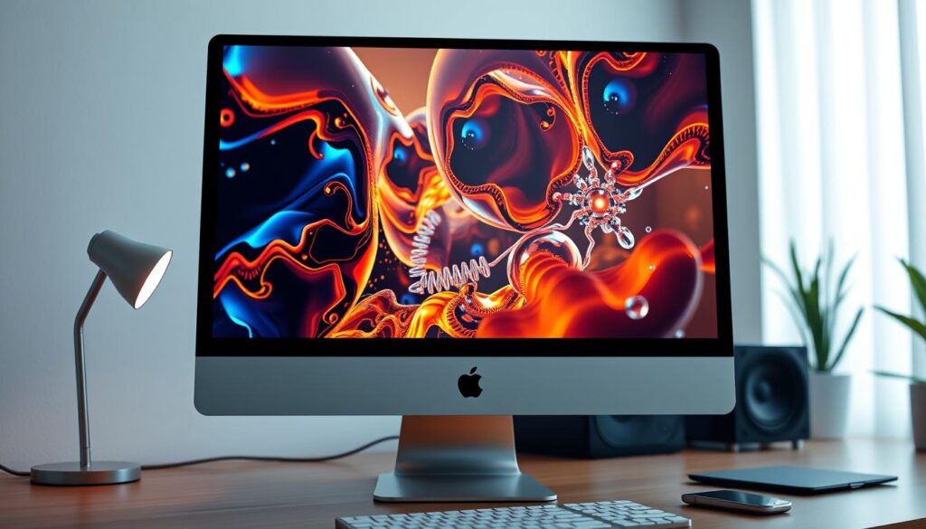 The M4 chip’s design is also super efficient. This lets the new iMac run long on battery and stay cool. It’s a huge leap in desktop computing, making complex tasks easy.